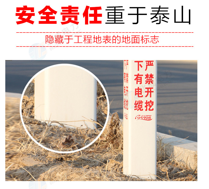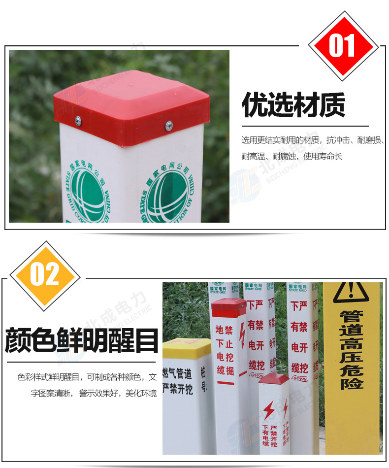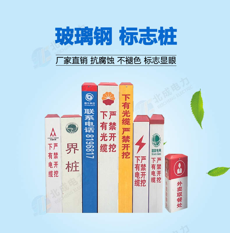 標志樁按用途分為: 電纜標志樁、油氣標志樁、通信標志樁、光纜標志樁、自來水標志樁、鐵路標志樁、公路里程樁。 性能指標: 1、拉伸強度≥160MPa 2、彎曲強度≥190MPa 3、浸水后彎曲強度≥150MPa 4、巴氏硬度≥38 5、環鋼度(5%)≥50KPa 6、熱變形溫度≥160℃ 7、氧指數26% 石家莊北成電力科技有限公司 聯系電話: 17603245663(微信同號) / 0311-67593878